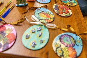 Ребята занимались изготовлением пасхальных изделий в технике декупаж. Сначала красками раскрашивали заготовки из дерева, на которые затем приклеивали понравившийся рисунок и закрепляли готовый результат глянцевым акриловым лаком.