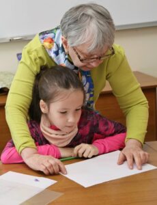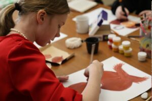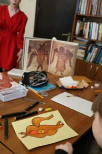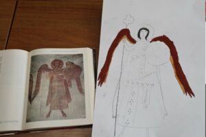 На уроке церковного искусства дети познакомились с творчеством Феофана Грека — известного византийского и русского иконописца и мастера фресковой живописи. Вниманию детей был представлен красочный фотоальбом с основными работами мастера, в числе которых — образ Пантократора в куполе Преображенской церкви в Новгороде. В альбоме были детально представлены отдельные элементы этой росписи, которые дети попытались изобразить на бумаге.